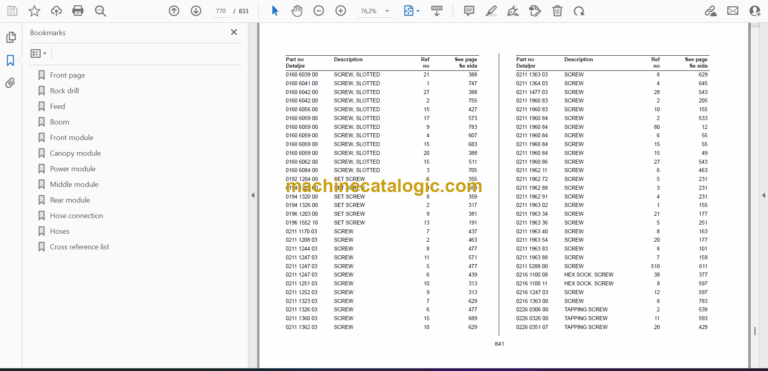 Front page Rock drill Feed Boom Front module Canopy module Power module Middle module Rear module Hose connection Hoses Cross reference list