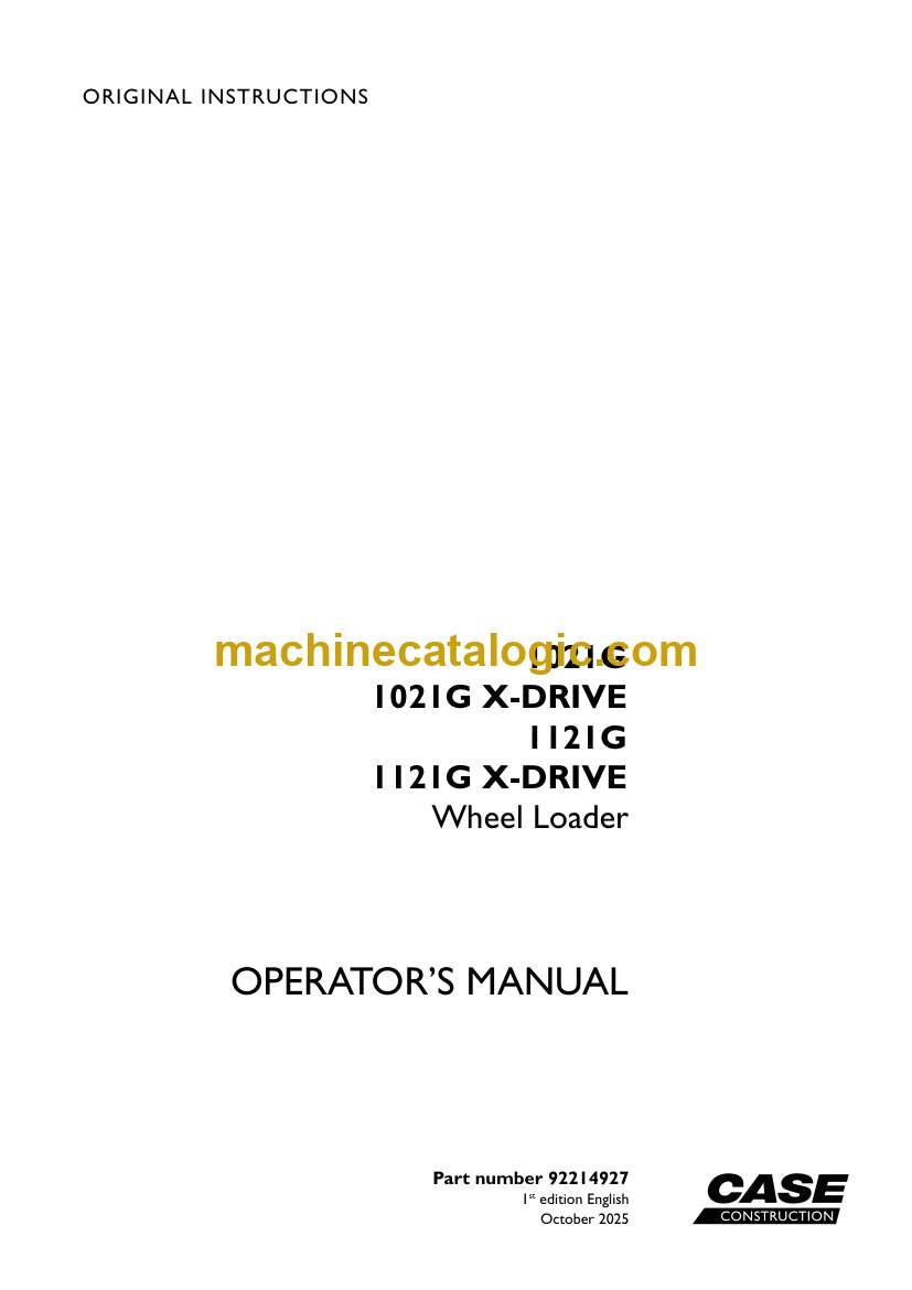 Case 1021G, 1021G X-DRIVE, 1121G, 1121G X-DRIVE Wheel Loader Operators Manual (92214927) (October 2025)