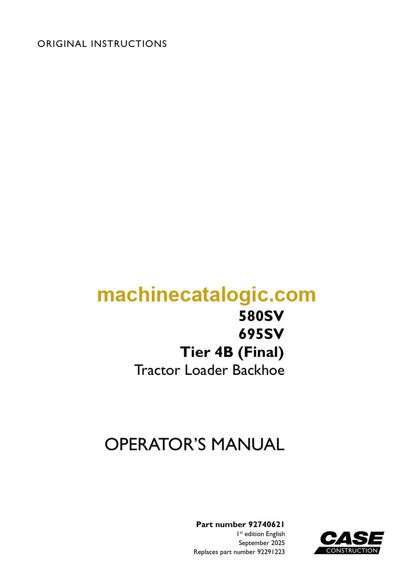 Case 580SV, 695SV Tier 4B Final Tractor Loader Backhoe Operators Manual (92740621) (September 2025)