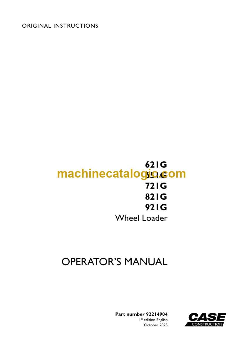 Case 621G, 651G, 721G, 821G, 921G Wheel Loader Operators Manual (92214904) (October 2025)
