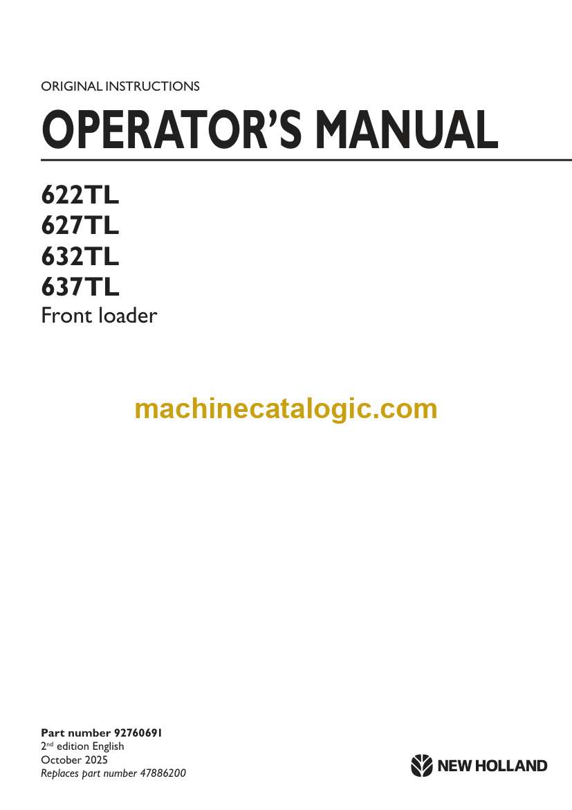 Case 622TL, 627TL, 632TL, 637TL Front Loader Front loader Operators Manual (92760691 Replaces 47886200) (October 2025)