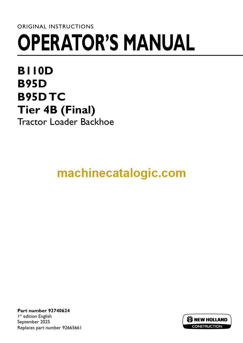 Case B110D, B95D, B95DTC Tier 4B Final Tractor Loader Backhoe Operators Manual (92740624) (September 2025)
