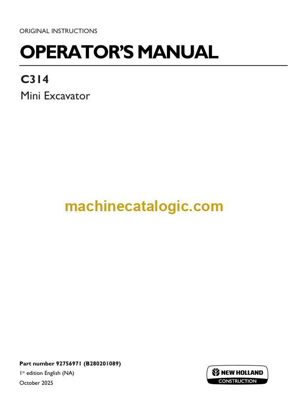 Case C314 Mini Excavator Operators Manual (92756971, B280201089) (October 2025)