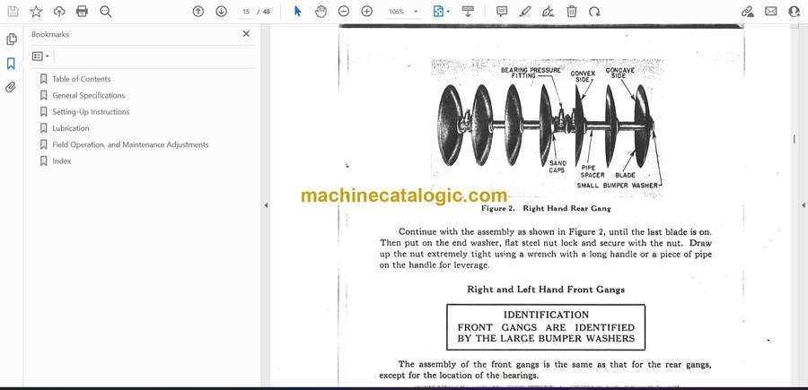 Table of Contents General Specifications Setting-Up Instructions Lubrication Field Operation, and Maintenance Adjustments Index