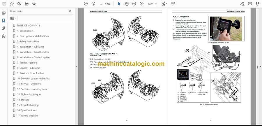 A: It’s typically a standard PDF you can search by word, so you can jump right to hydraulics, frame, or electrical sections.