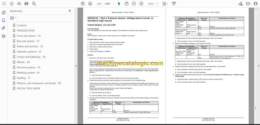 Out in small grains or canola, this air cart spends its life in dust, fertilizer, and long days chasing seeding windows. This service manual helps you trace hydraulic, brake, and metering problems step by step, so you can isolate what’s actually wrong before you start throwing parts at it. Say your fan speed keeps hunting: with this, you’ll follow a set sequence—check power and grounds, verify hydraulic flow, inspect sensors—so you find the weak link instead of guessing.
