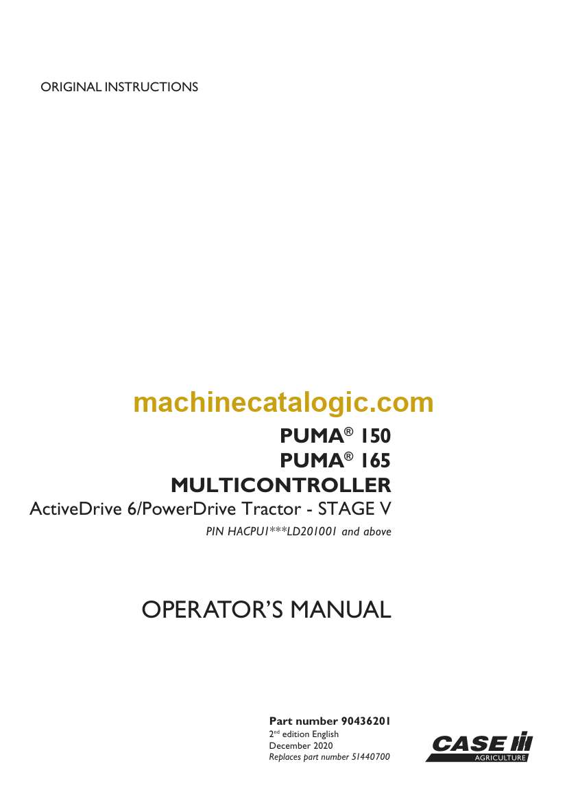 Case Puma 150, 165 Multicontroller Stage 5 ActiveDrive 6 PowerDrive Tractor Operator Manual