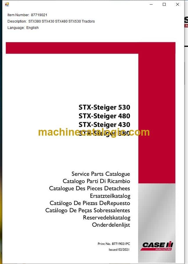 These STX-Steiger 530, 480, 430, and 380 tractors spend their lives pulling big tillage and air-seeding gear in dusty, heavy-draft conditions, so you’re constantly into filters, pins, seals, and hoses. This Service Parts Catalog is what I use to nail down exactly which parts belong on which tractor, and how they relate in each assembly. If I’ve got an STX380 in the shop with a leaking front axle seal, I’ll open this catalog to trace the axle breakdown, confirm the right seal, snap ring, and hub hardware, and make sure I don’t miss any small parts when I order.