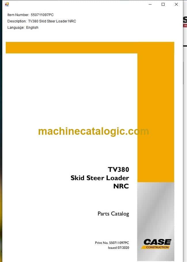 The Case TV380 skid steer usually lives in mud, gravel, and demolition debris, doing load-and-carry, grading, and attachment work all day. This NRC Parts Catalog is what I grab when I need to positively ID what’s on the machine before ordering, especially around filters and planned-maintenance items. If a TV380 comes in for a full service and I find a weeping hydraulic fitting or a chewed-up bushing near the loader arm, this catalog lets me trace that assembly, see every seal and fastener in the stack, and order exactly what matches that particular build.