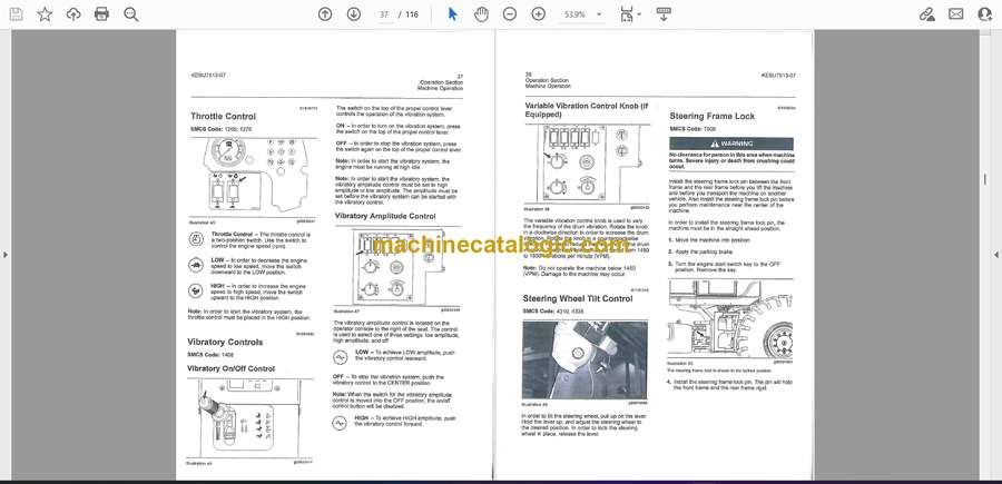 These Cat E‑series compactors usually live on hot, dusty job sites—paving crews, road rebuilds, parking lots where you’re starting early and running hard all day. This operation and maintenance manual helps you set a rhythm: what to trace, check, and service daily, weekly, and at longer intervals so the machine stays predictable. Picture this: you’re in peak season, crew waiting, mix trucks lined up, and the drum won’t vibrate; with this manual you’d typically have already caught the loose connection or low hydraulic level during your morning walk‑around.