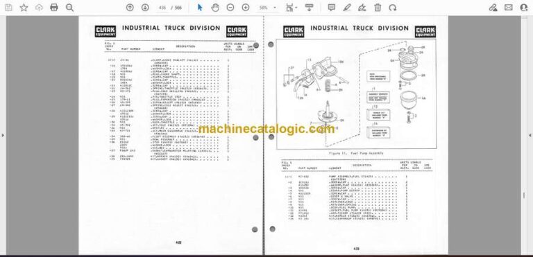 This Clark C300-40 forklift usually lives in warehouses, loading docks, and tight yard spaces, moving pallets on and off trucks all day. This manual helps you match the exact Clark part numbers to what you’re seeing on the truck, so you’re not guessing during a breakdown or scheduled service. Say you’ve got a leaking hydraulic hose at the mast or a damaged brake linkage—this book lets you trace that assembly, identify the right subcomponent, and order the correct replacement without pulling the wrong piece off twice.