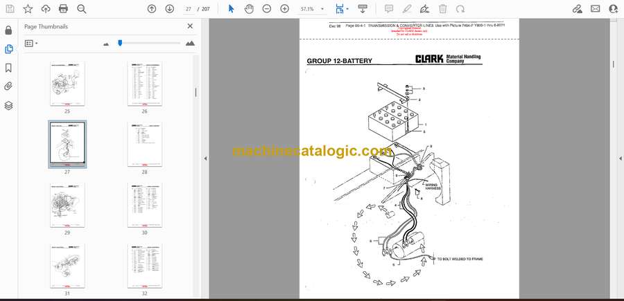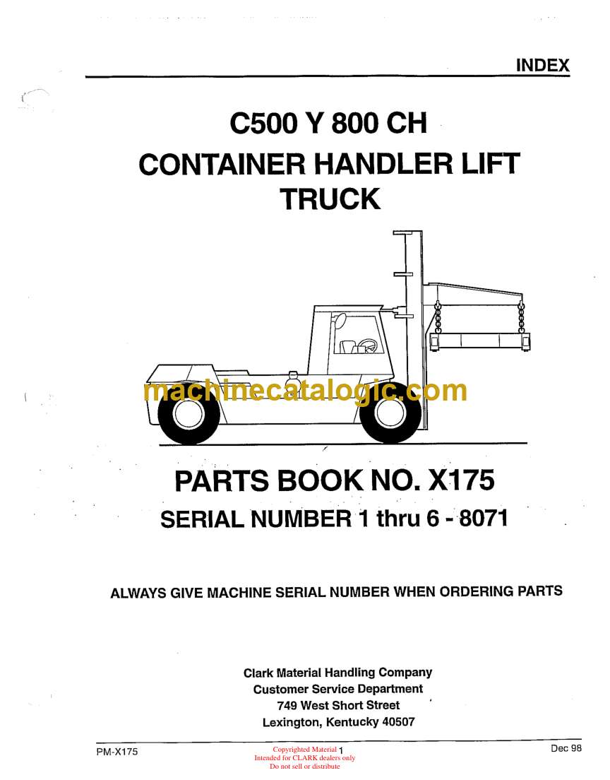 These C500 Y 800CH container handlers spend their lives loading and stacking boxes in rough yards, ports, and rail terminals, so parts get hammered and swapped often. This parts manual is what I’d pull out when I’m trying to match what’s on the truck to the correct Clark part number, especially on older or modified units. If, for example, the accelerator linkage gets sloppy or bent, this book lets me trace exactly which lever, rod, or bushing I’m looking at so I don’t guess and order the wrong sub-piece.