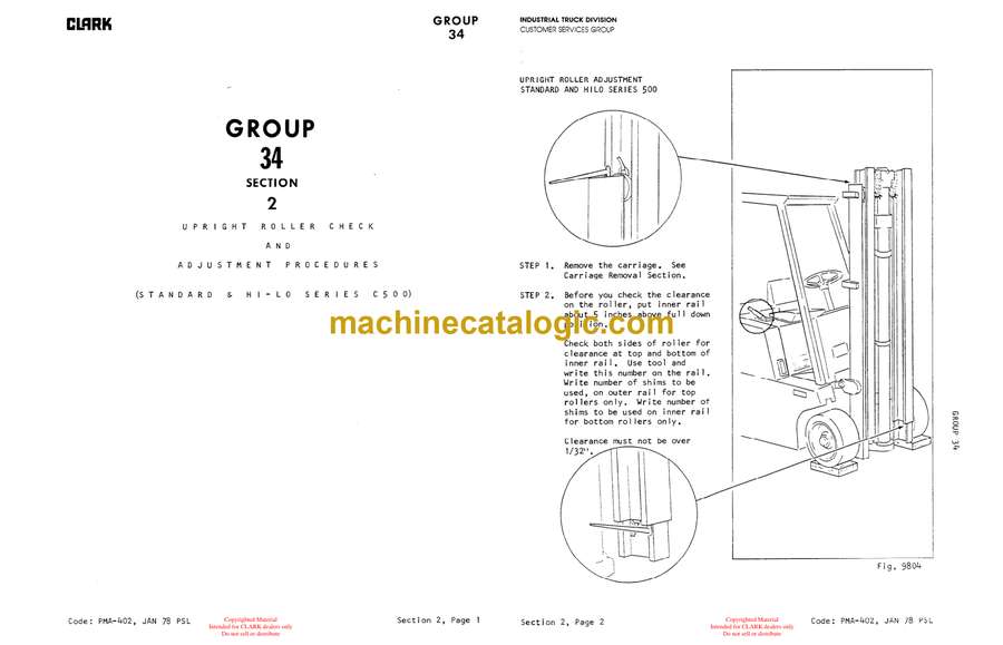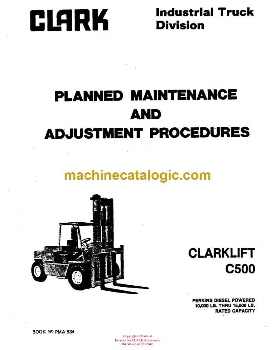 A Clark C500 with a Perkins diesel usually lives in loading docks, yards, and warehouses where it’s constantly shuttling pallets and heavy stock. This planned maintenance and adjustment procedures manual helps you stay ahead of breakdowns by laying out how to inspect, adjust, and test key systems on a regular schedule. When you’ve got a truck that’s slow to lift, pulling to one side under braking, or showing a charge light on the dash, this is the kind of document you’d use to trace the fault, verify settings, and get it back into service without guesswork.