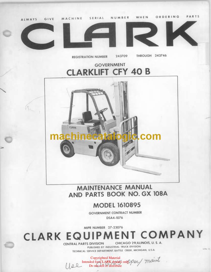 Clark Clarklift CFY 40B Maintenance Manual and Parts Book (Model 1610895)