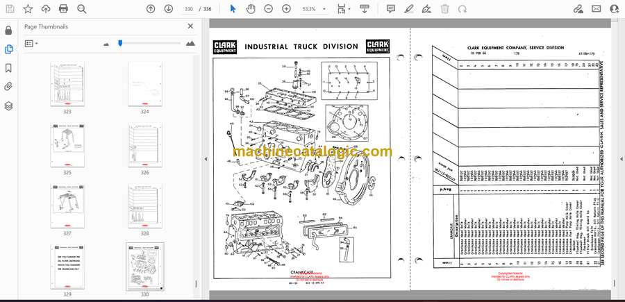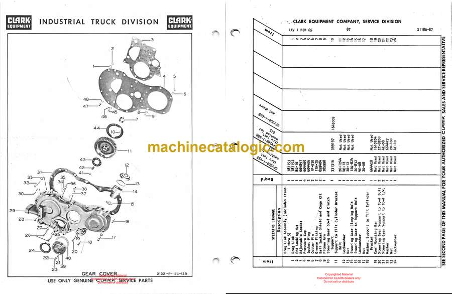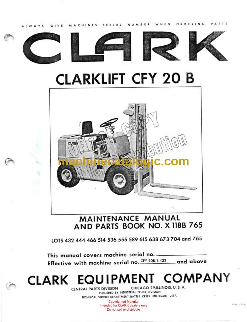 This Clark CFY20B forklift usually spends its life loading pallets, feeding production lines, and shuttling stock around warehouses or yards. This parts manual is what I’d keep open when the truck is stripped down and I need to be sure which exact Clark part I’m staring at. If, for example, the accelerator linkage is sloppy or the drive axle is leaking, this book lets me trace each subcomponent, match it to the correct part number, and avoid ordering the wrong bits.