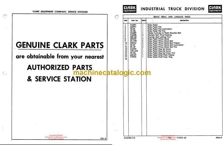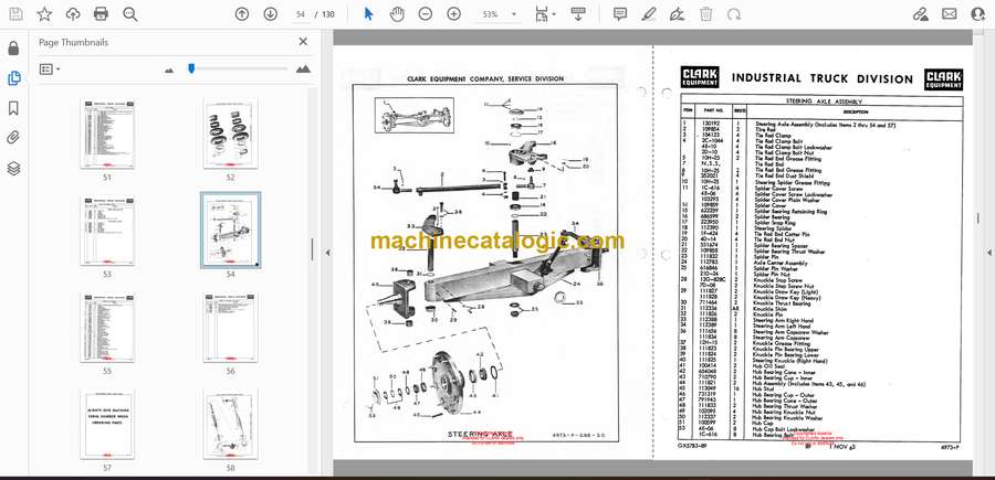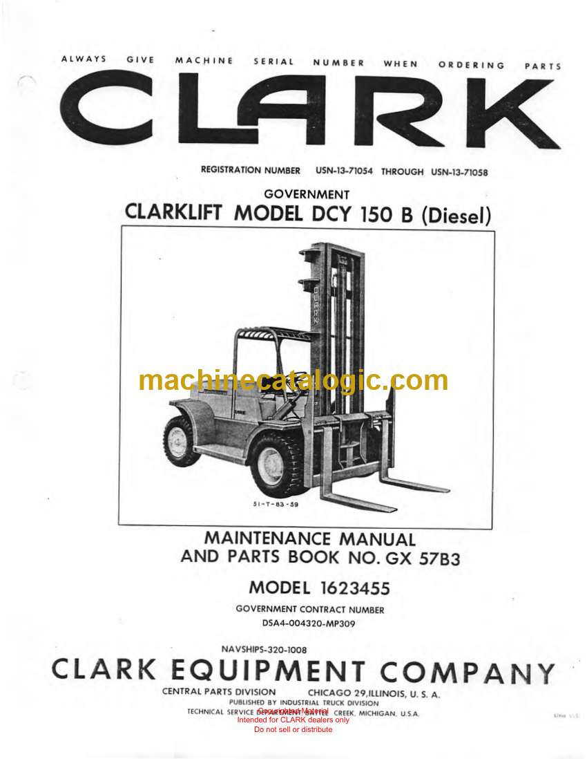 This DCY150B diesel Clarklift is a big yard and dock truck—loading steel, lumber, and heavy pallets in rough outdoor conditions. This parts manual is what I’d keep open on the bench or tablet when the truck is down, so I can match what I’m seeing on the mast, drive axle, or steering gear with the correct Clark part description. For example, when you’ve got the brake system apart and find a worn linkage or seal, this book lets you confirm exactly which subcomponent you’re holding before you order, so you don’t lose a day waiting on the wrong piece.