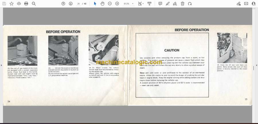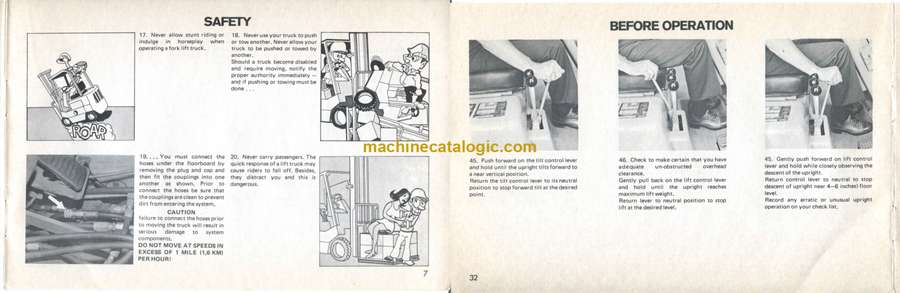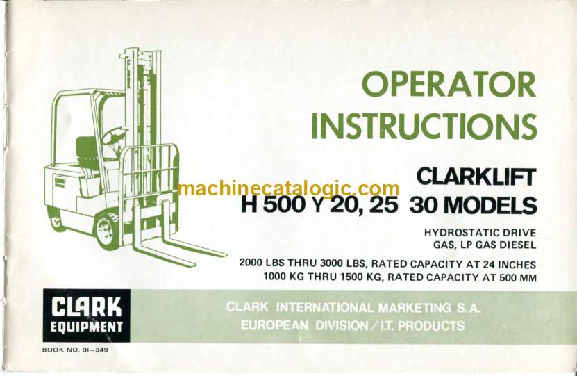 These Clark H500Y20, H500Y25, and H500Y30 forklifts spend their lives loading trucks, feeding production lines, and shuttling heavy pallets around yards and warehouses. This operators manual is what I’d keep in the cab or shop office to show drivers exactly how to run and shut down the truck without abusing the mast, brakes, or transmission. When someone complains that the truck “won’t lift like it used to” or stalls after startup, I use this book to verify the correct startup sequence, check the daily inspection points, and make sure the operator isn’t skipping any warmup or safety steps that can cause those problems.