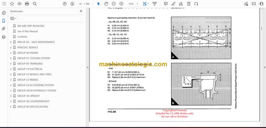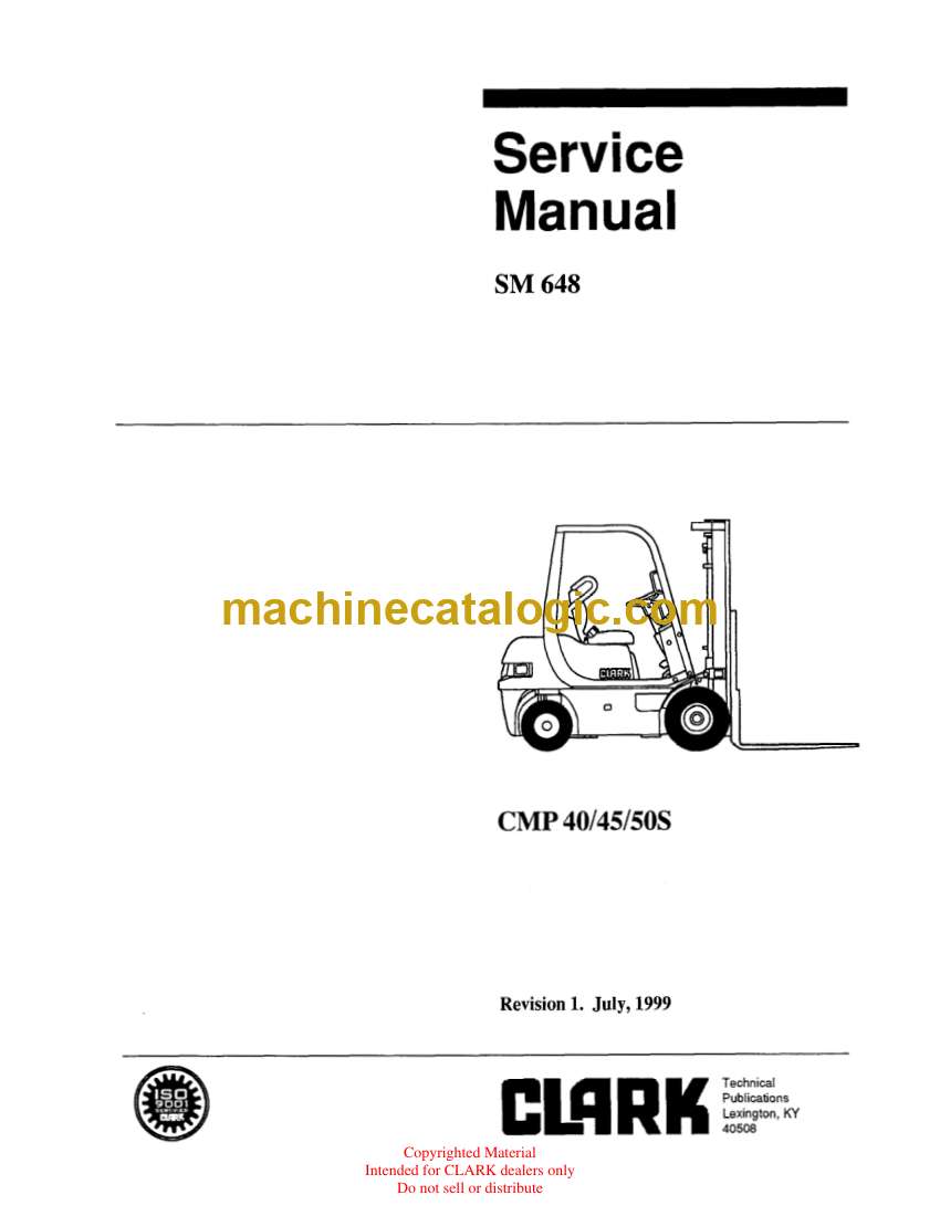 These Clark CMP40, CMP45, CMP50S forklifts spend their lives loading trucks, shuttling pallets, and working hard in warehouses and yards, often in tight spaces and rough conditions. This service manual is what I’d keep on hand whenever I need to trace a fault, tear into a major component, or put one of these trucks back together correctly. If, for example, the truck starts pulling weakly under load and you’re not sure if it’s engine, cooling, or transaxle related, this book walks you through a logical path: what to inspect first, how to test it, and how to disassemble and reassemble without guessing.