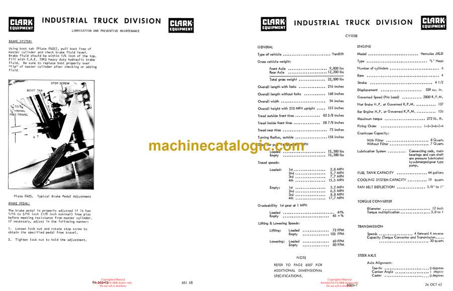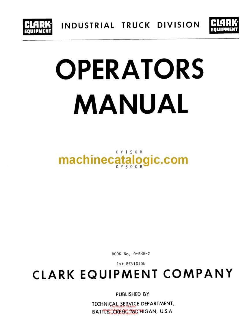 These Clark CY150B and CY300B machines are typically used for heavy material handling in yards, plants, and construction sites, where they see a lot of stop‑and‑go work and tight maneuvering. This operators manual helps you run them the way they were designed to be run—using the controls correctly, warming up and shutting down without abusing the drivetrain, and catching small issues before they turn into big repairs. If, for example, the machine starts jerking when you shift direction or feels sluggish on startup, this book walks you through the right operating checks and daily inspections before you call in a mechanic.