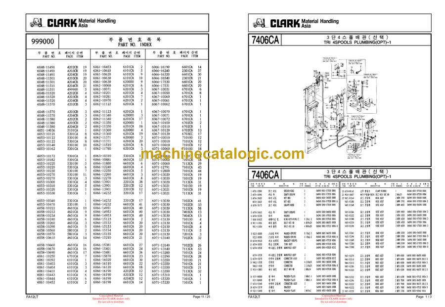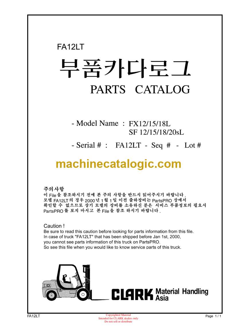 These Clark FX and SF series forklifts spend their lives loading pallets, feeding production lines, and working tight aisles in warehouses and light industrial yards. This parts manual is what I keep beside me when I’m tearing one down and need to be sure I’m looking at the right valve, bracket, or harness before ordering anything. If, for example, you’re chasing a hydraulic leak around the mast or carriage, this book lets you match what’s on the truck to the correct seal kit or hose assembly, so you don’t lose a shift waiting on the wrong part.