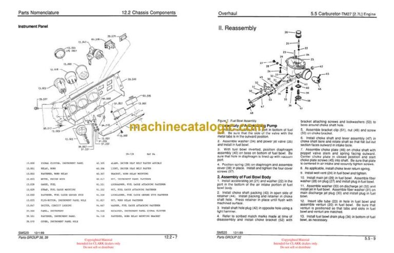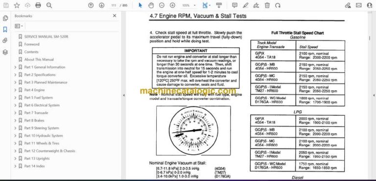 A Clark GCS forklift usually spends its days loading trucks, feeding production lines, and shuttling pallets in tight warehouses. This service manual is what I’d keep open when I need to trace a hydraulic issue, chase an electrical fault, or strip down a major component without guessing. If, for example, the mast won’t lift under load or the steer axle feels loose, this book walks you through a logical check‑and‑verify process so you can confirm the fault before you start unbolting parts.