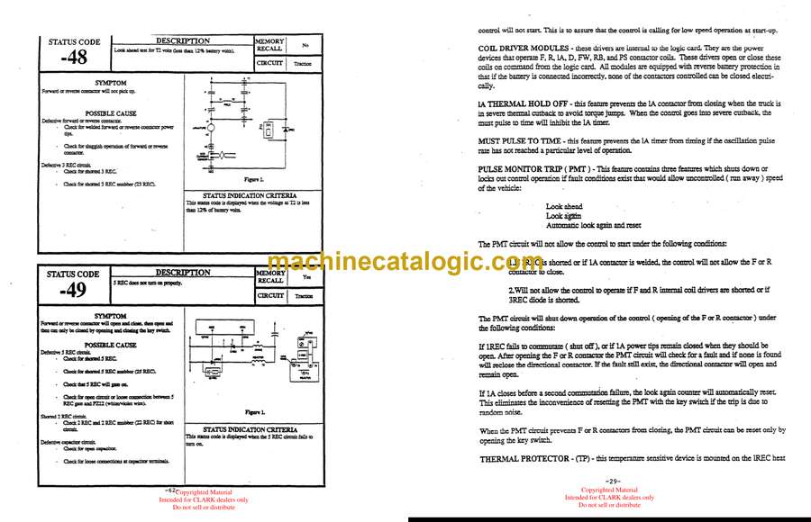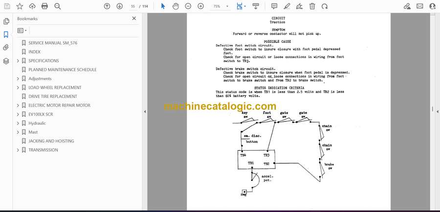 An OP15B order picker spends its life running aisles, lifting operators to pull stock in warehouses and distribution centers. This service manual is what I’d keep on hand to trace electrical or hydraulic faults, plan maintenance, and make sure anything I tear down goes back together correctly. If, for example, the truck won’t lift or creeps when it should be stopped, I’d use this book to work through the checks in order—verify controls, test the motor circuit, then confirm whether it’s an adjustment issue or a component that really needs replacing.