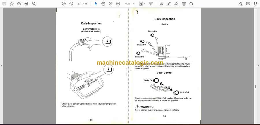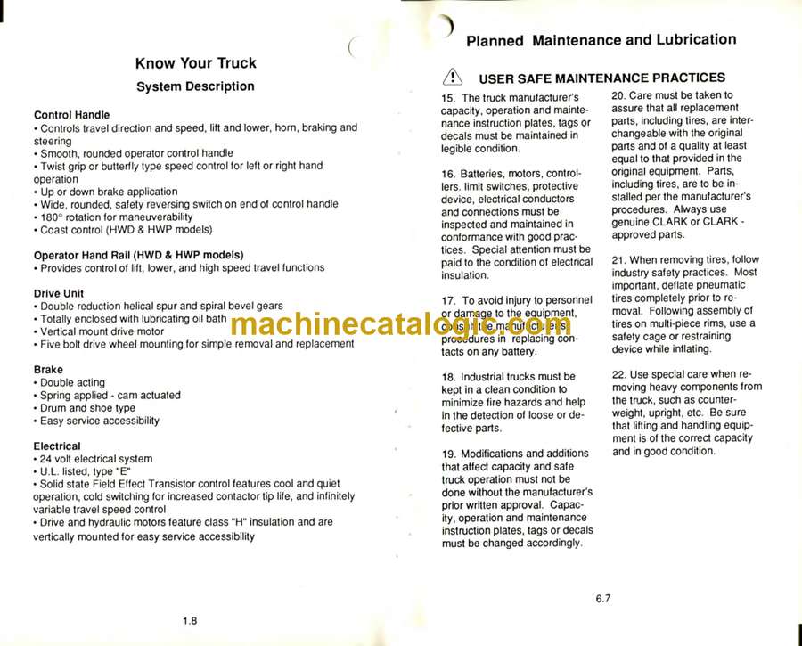 These Clark PWD/HWD series forklifts are everyday workhorses in warehouses, loading docks, and tight yard spaces, moving pallets on and off trucks all shift long. This operator’s manual is what I keep handy to make sure the truck is started, run, and shut down the way Clark intended, so we don’t cook a drive motor or wreck a mast from bad habits. If, for example, an operator reports the truck won’t move after startup or the hydraulics feel weak, I use this book to verify the correct control positions, startup sequence, and daily checks before I start chasing a “fault” that’s really just misuse.