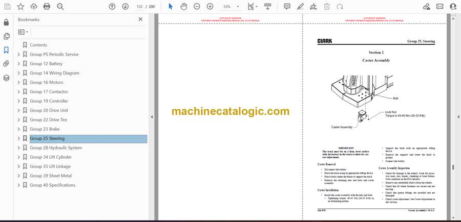 These Clark PWX30-40 and HWX30-40 pallet trucks live in tight warehouse aisles, loading docks, and trailers all day, so when they act up you need a clear path to the fault, not guesswork. This service manual is what I’d pull when I have an intermittent no-travel complaint or weak lift under load and need to trace whether it’s battery, wiring, controls, or motor. It walks you through a logical approach so you can inspect, test, and reassemble the truck correctly instead of just swapping parts.