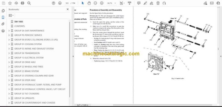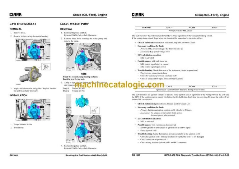 These Clark S-series forklifts spend their lives loading trucks, feeding production lines, and shuttling pallets in tight warehouse aisles. This service manual is what I’d pull out when a truck won’t start, runs rough under load, or loses lift power and I need to trace the fault logically instead of guessing. It walks you through how to approach the Ford engine and truck systems in a way that keeps you from tearing into the wrong component—like when an operator complains of power loss and smoke, and you need to isolate whether it’s fuel, ignition, or a mechanical issue before you start stripping parts.