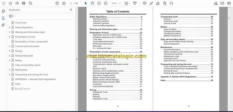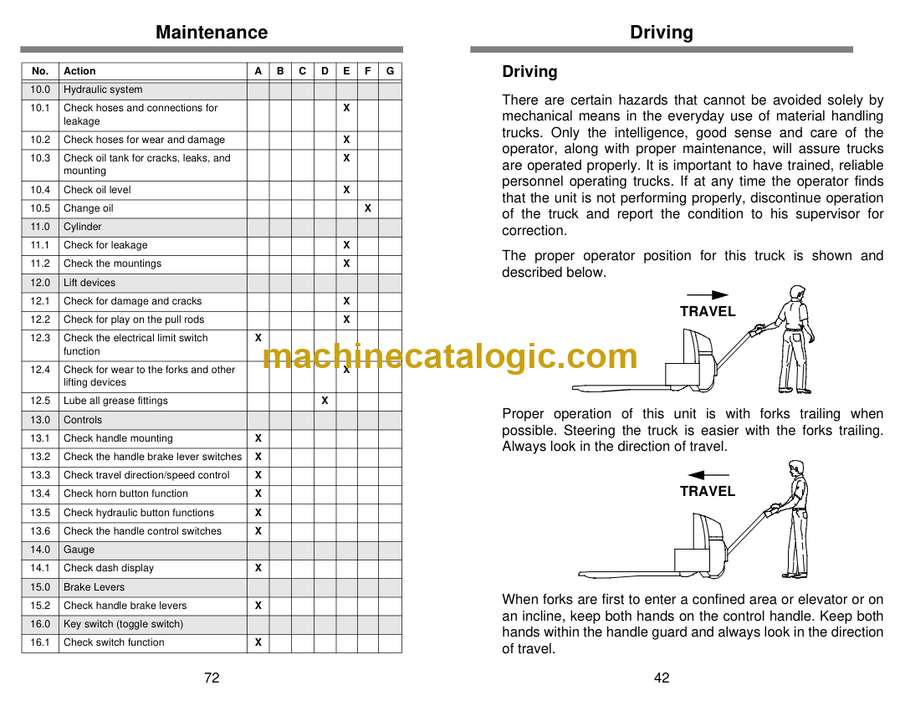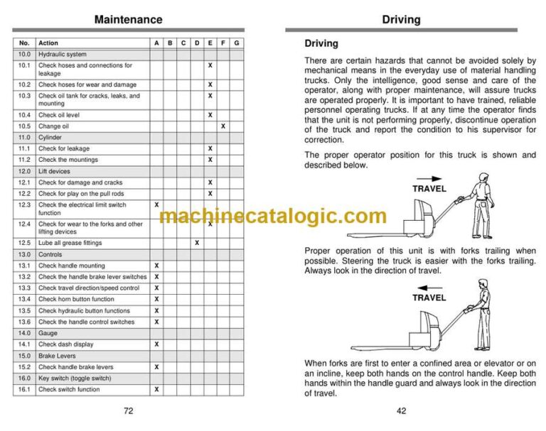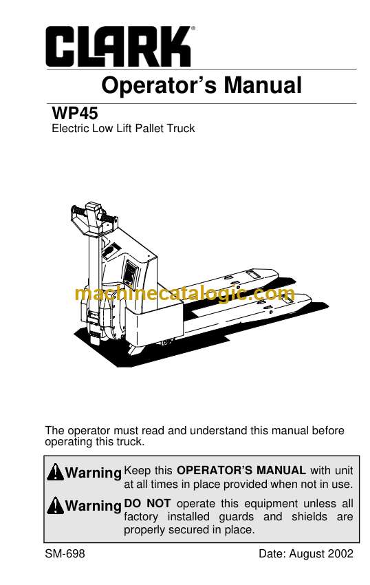 On a WP45 pallet truck, you’re usually shuttling loaded pallets in warehouses, loading docks, and tight trailers all day long. This operators manual is what I’d keep handy to make sure the truck is started, driven, and shut down the right way so we don’t cook the drive motor, wreck the hydraulics, or damage the mast. If an operator reports that the truck won’t move after startup, or the tiller controls feel “dead,” I’d use this book to walk them through the basic checks and proper control sequence before I ever grab a wrench.