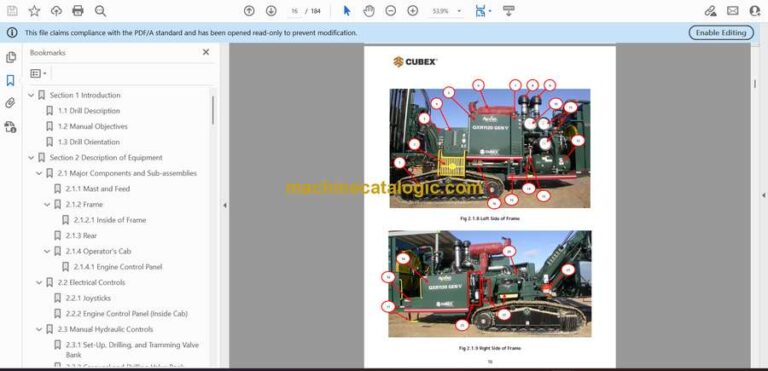 Out on a bench or quarry face, this Cubex surface drill spends its life working hard on uneven ground, around loose rock and tight patterns. This operators manual is what I’d keep handy to understand how the controls should feel, how the machine should react under load, and what to check before and after a shift. If, for example, the feed isn’t tracking straight or the rotation bogs when you start a hole, this is the reference I’d use to verify proper operating steps before assuming there’s a mechanical failure.