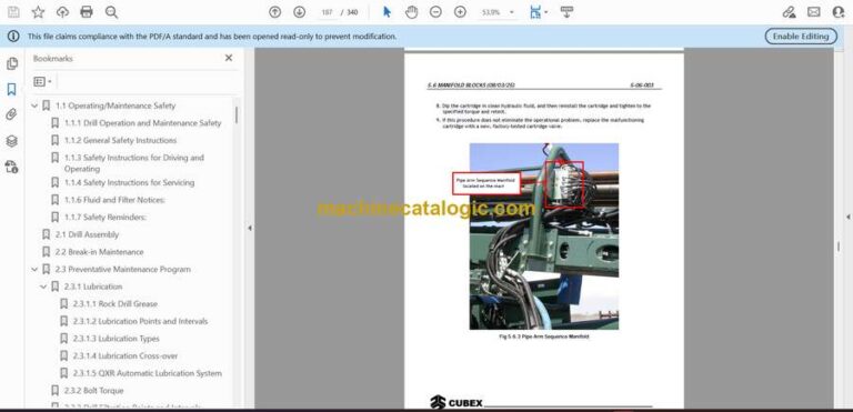 Out on a benching or production blast pattern, the Cubex QXR 1320 surface drill lives in dust, vibration, and long hours. This maintenance manual is what I’d keep handy to plan routine services and decide what to inspect before the machine ever gives trouble. If, for example, the drill starts losing penetration rate or you’re seeing odd noises from the rotation head, I’d use this manual to trace possible causes, verify basic adjustments, and decide what needs to be stripped, cleaned, or replaced before it becomes a major failure.