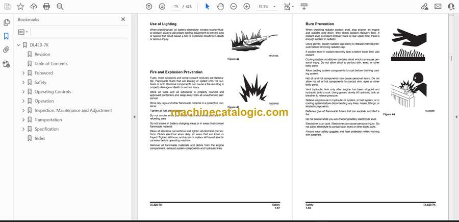 Out on a quarry floor, in a feed yard, or loading trucks at a gravel pit, the DL420-7K lives in dust, mud, cold starts, and long days. This operation and maintenance manual is about keeping a rhythm: what you trace every morning, what you check every week, and what you service before the busy season so the loader stays predictable. Say you’re pushing hard during harvest and a warning light pops—this book helps you isolate whether you can finish the shift, or if you’d better park it and bleed, test, or adjust something first.
