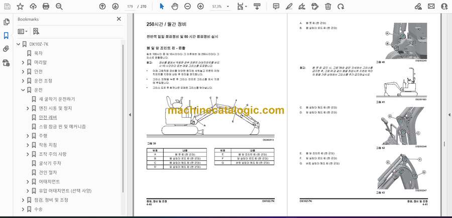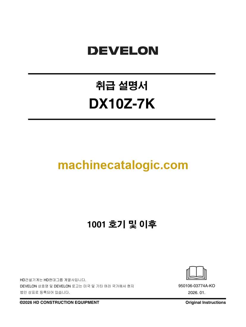 Develon DX10Z-7K Mini Excavator Operation and Maintenance Manual – Korean Language (한국어) (950106-03774A-KO)