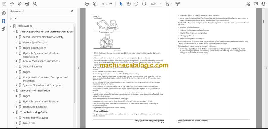 That DX165WR-7K usually lives on pavement or tight urban jobs, ducking around traffic and utilities, doing road repair, trenching, and lifting manholes. This shop manual’s what you use when you’re past quick checks and you’re ready to tear in deep without guessing. Say you’ve got a swing bearing noise: this helps you plan the teardown, trace the play, inspect the race and bolts, then reassemble without leaving a shim out or misaligning the slew gearbox.