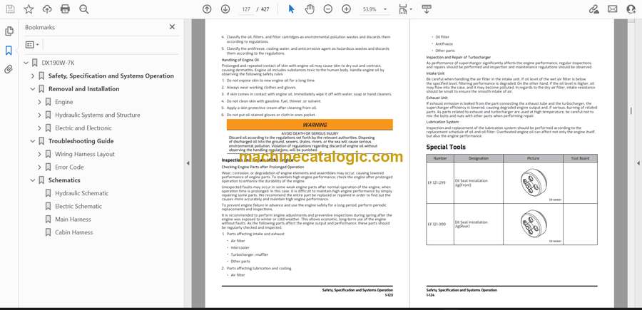 Out on road jobs, pipe work, or tight urban sites, that DX190W-7K is your go‑to for bouncing between holes without a lowboy. This shop manual’s what you reach for when you’re past simple filters and need to tear down major components, trace a fault properly, and get it back together without mystery bolts left over. Say you’ve got swing noise and metal in the oil: this is what you’d use to plan the teardown, inspect the gearbox, verify clearances, then align and torque everything so it doesn’t come back on a hook.