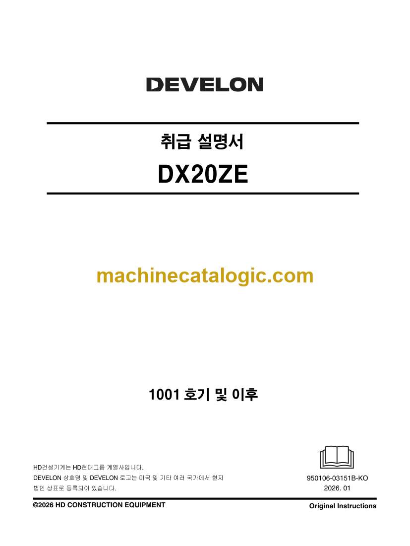 Develon DX20ZE Mini Excavator Operation and Maintenance Manual – Korean Language (한국어) (950106-03151B-KO)