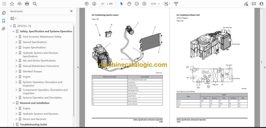 Out on pipe jobs, demo sites, and muddy utility trenches, this DX225LC-7X is your bread‑and‑butter digger, usually working long days in rough ground and tight spots. This shop manual helps you plan big teardowns, trace faults through the systems, and then reassemble everything so it starts, swings, and tracks like it should. Say you’ve got a boom drift issue and metal in the filter; this is what you use to strip the circuit, inspect each component on the bench, verify clearances, follow the torque sequence, and get it back together without guessing.