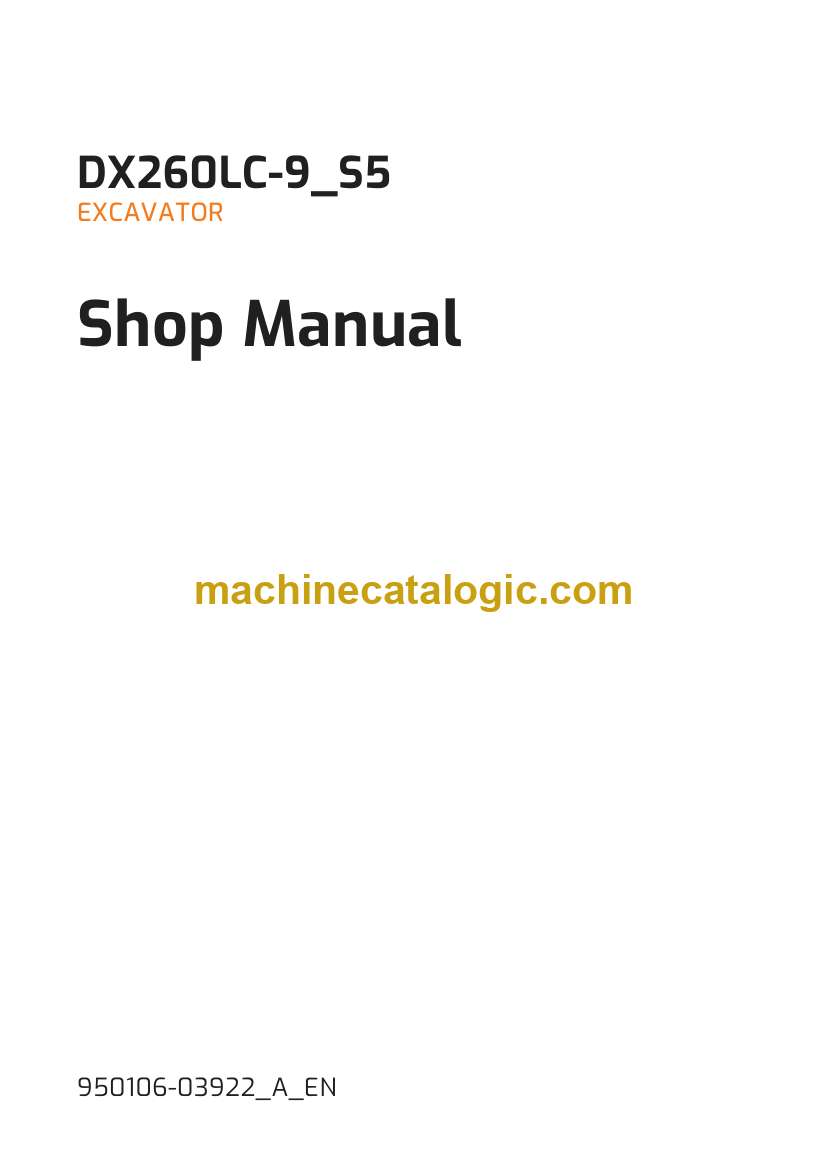 Out on sites, this DX260LC-9 usually lives in mud, rock, and demolition mess, loading trucks, cutting grade, or breaking out foundations all day. This shop manual is for when you’re past simple filters and grease and you’re ready to strip major components, trace faults properly, and put everything back so it tracks straight and digs clean. Say you’ve got swing noise and metal in the oil—this is what you’d use to plan the teardown, inspect the bearings and gear faces, then reassemble without forgetting a shim or misaligning the housing.
