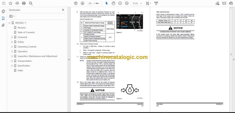 On a DX350LC-7 you’re usually working in mud, rock, demo rubble, or tight construction sites where downtime costs real money. This operation and maintenance manual helps you set a steady rhythm: what you trace every morning, what you check every 250-ish hours, what you inspect before a long shift so the machine stays predictable. Say you’re in peak season, running double shifts; this book walks you through how to verify fluids, filters, tracks, and hydraulics so you don’t blow a hose or cook a pump right when trucks are lined up waiting.