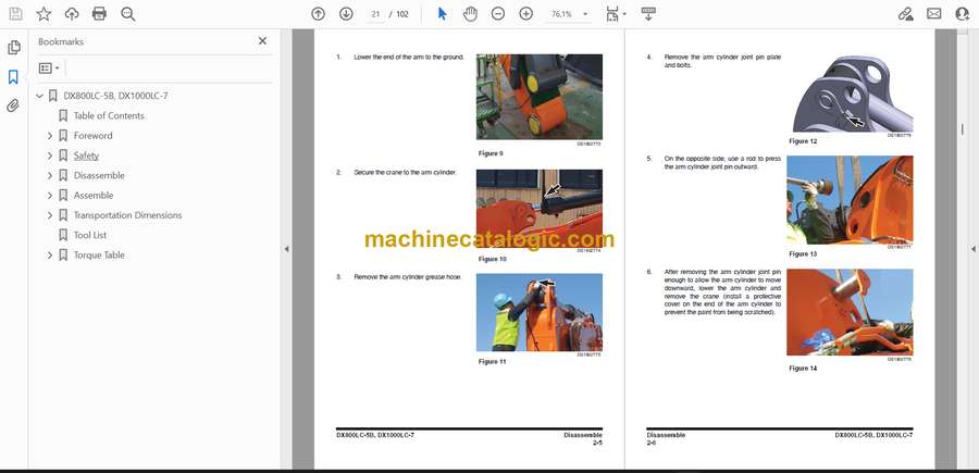 Always depressurize and lock out hydraulic and electrical systems before you crack any lines or start disassembly on the DX800LC-5B.