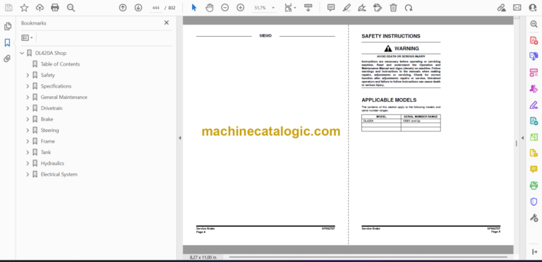 DL420A Shop Table of Contents Safety Specifications General Maintenance Drivetrain Brake Steering Frame Tank Hydraulics Electrical System