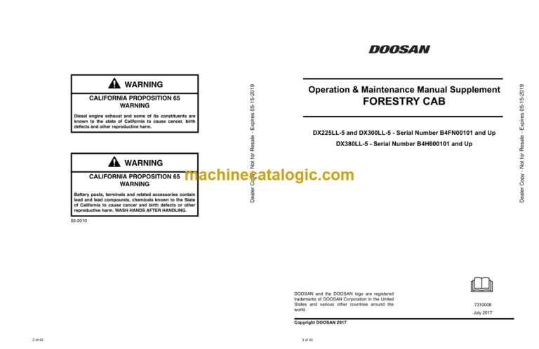 Doosan DX225LL-5, DX300LL-5, DX380LL-5 Excavator Operation and Maintenance Manual Supplement (B4FN00101, B4H600101)