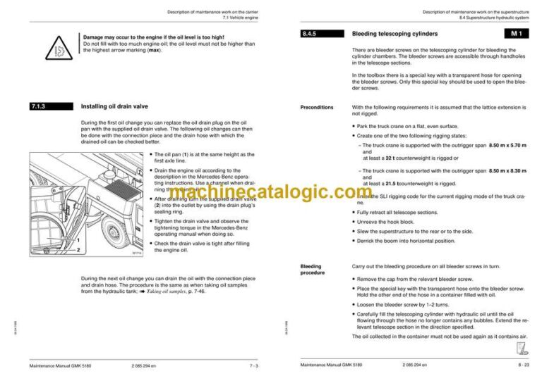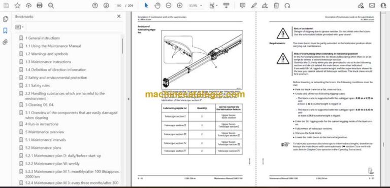 On a GMK5180 that spends its life lifting heavy loads on construction sites, refineries, and plant shutdowns, this maintenance manual is what you use to plan service before things get expensive. It helps you line up intervals, know what to inspect first, and verify you’re putting the right fluids and adjustments in the right places. Say you’ve got a slewing motion that’s getting noisy or a boom function slowing down—this is the book you grab to trace the issue, decide what to inspect, and bring the crane back into safe, smooth operation without guesswork.