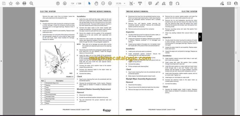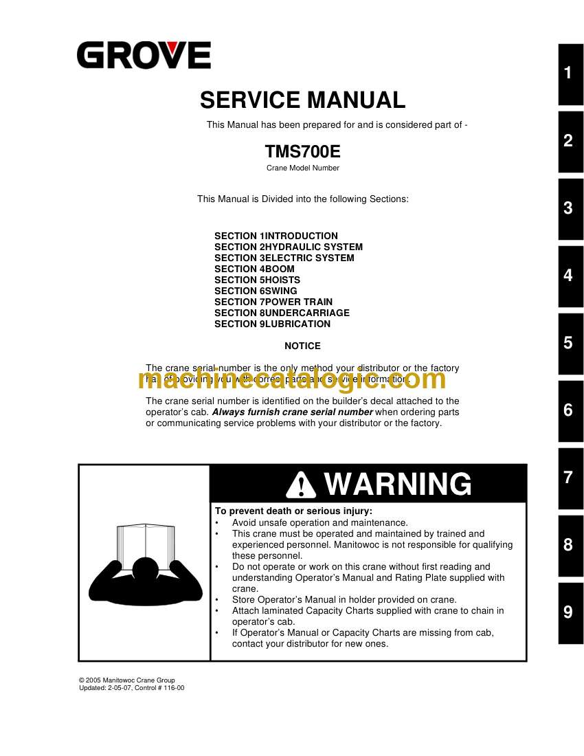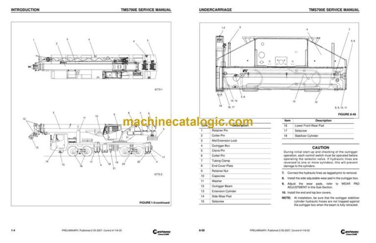 When this TMS700E is out on highway or plant work—picking bridge beams, setting tanks, feeding steel on tight sites—downtime costs real money. This service manual is what I’d pull when I need to trace a hydraulic issue, chase an electrical fault, or tear down a swing or boom component without guessing. For example, if the main boom won’t telescope under load, I’d use this to follow the hydraulic circuit, verify pressures and valve operation, and decide whether I’m resealing a cylinder or replacing a control valve.