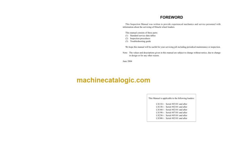 Hitachi LX110-7, LX130-7, LX160-7, LX190-7, LX230-7, LX300-7, LX360E, LX450-7 Inspection Manual
