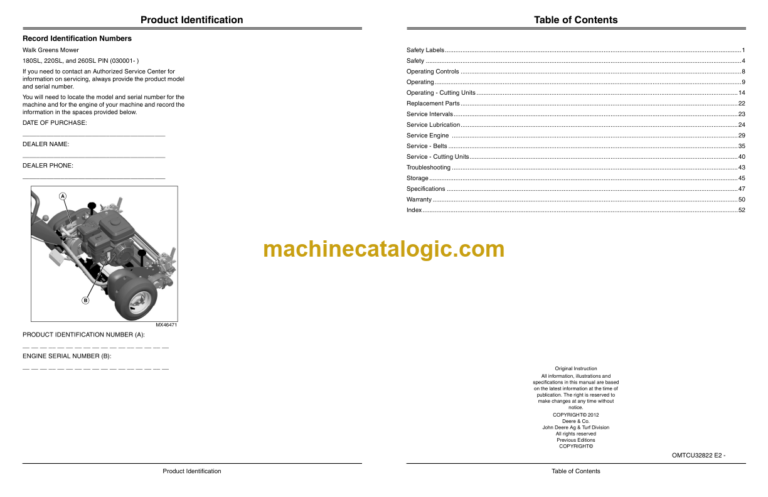 John Deere 180SL, 220SL and 260SL Walk Greens Mower INDEX: