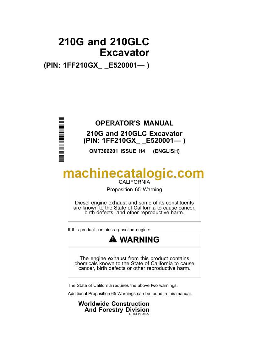 John Deere 210G And 210GLC Excavator Operators Manual (OMT306201)