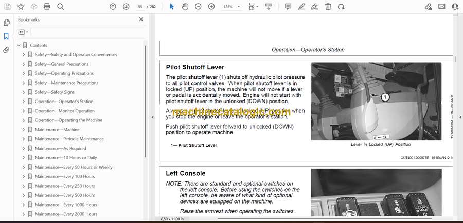• 210GLC Lift Capacity—Arm: 2.42 m (7 ft 11 in.); Bucket: 666 kg (1468 lb.); Shoe: 800 mm (32 in.)