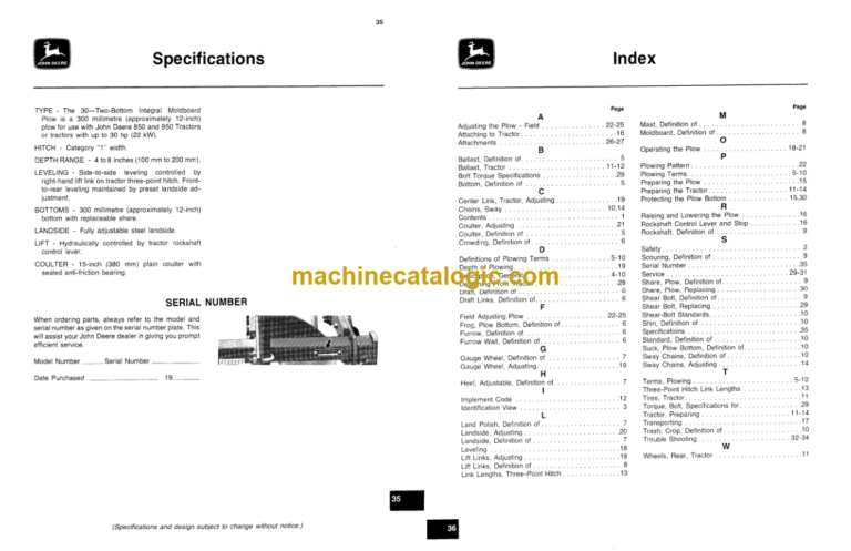 John Deere 30 Integral Plow INDEX: